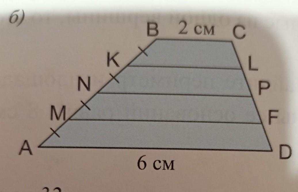 ABCD - трапеция, AD || MF || NP || KL. Используя данные на этом рисунке, найдите длины отрезков MF, NP, KL. (Только напишите ерунду, иначе БАН)