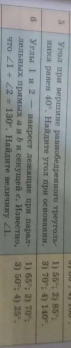 5, сумма углов треугольника 180 градусов, углы при основании равнобедренного треугольника равны, поэтому от 180 отнимаем угол при вершине равный 40 градусов, получается 140 сумма углов при основании и делим на два и того получаем, что угол при основании равен 70 градусов