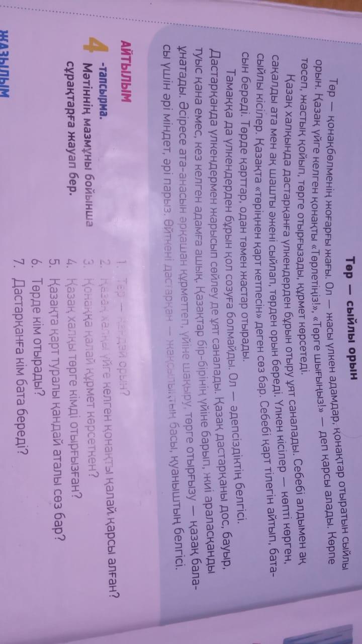 4. Қазақ халқы төрге жасы үлкен адамдарды, қонақтарды отырғызған.