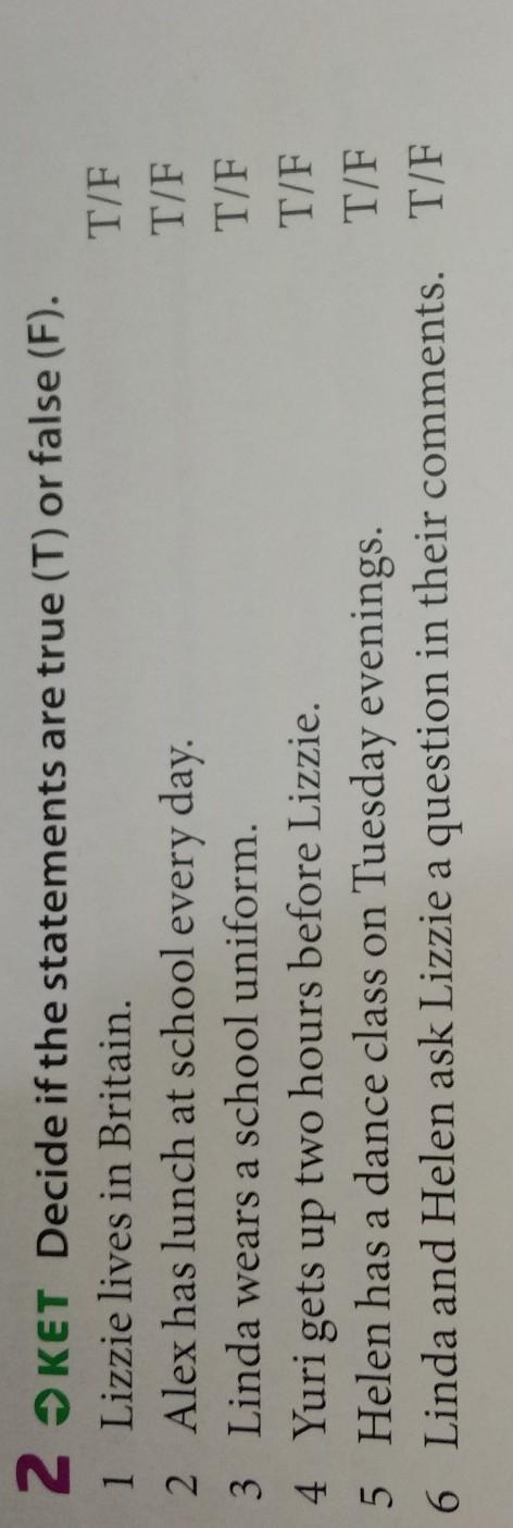 2 OKET Decide if the statements are true (T) or false (F).1 Lizzie lives in Britain.2 Alex has lunch at school every day.3 Linda wears a school uniform.4 Yuri gets up two hours before Lizzie.5 Helen has a dance class on Tuesday evenings.6 Linda and Helen ask Lizzie a question in their comments. T/FT/FT/FT/FT/FT/F