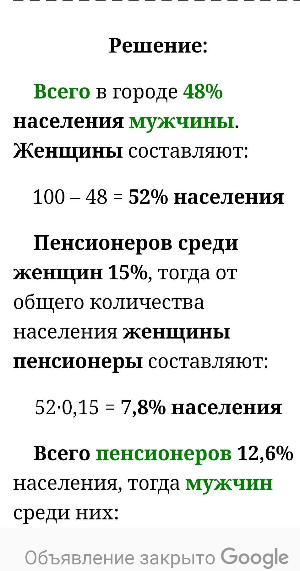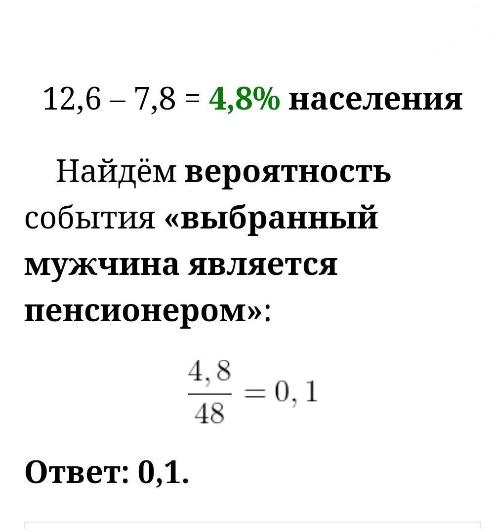 в городе 48% взрослого населения - мужчины. Пенсионеры составляют 12,6% взрослого населения, причем доля пенсионеров среди женщин равна 15%. Для социологического опроса выбран случайным образом мужчина, проживающий в этом городе. Найдите вероятность события «выбранный мужчина является пенсионером».