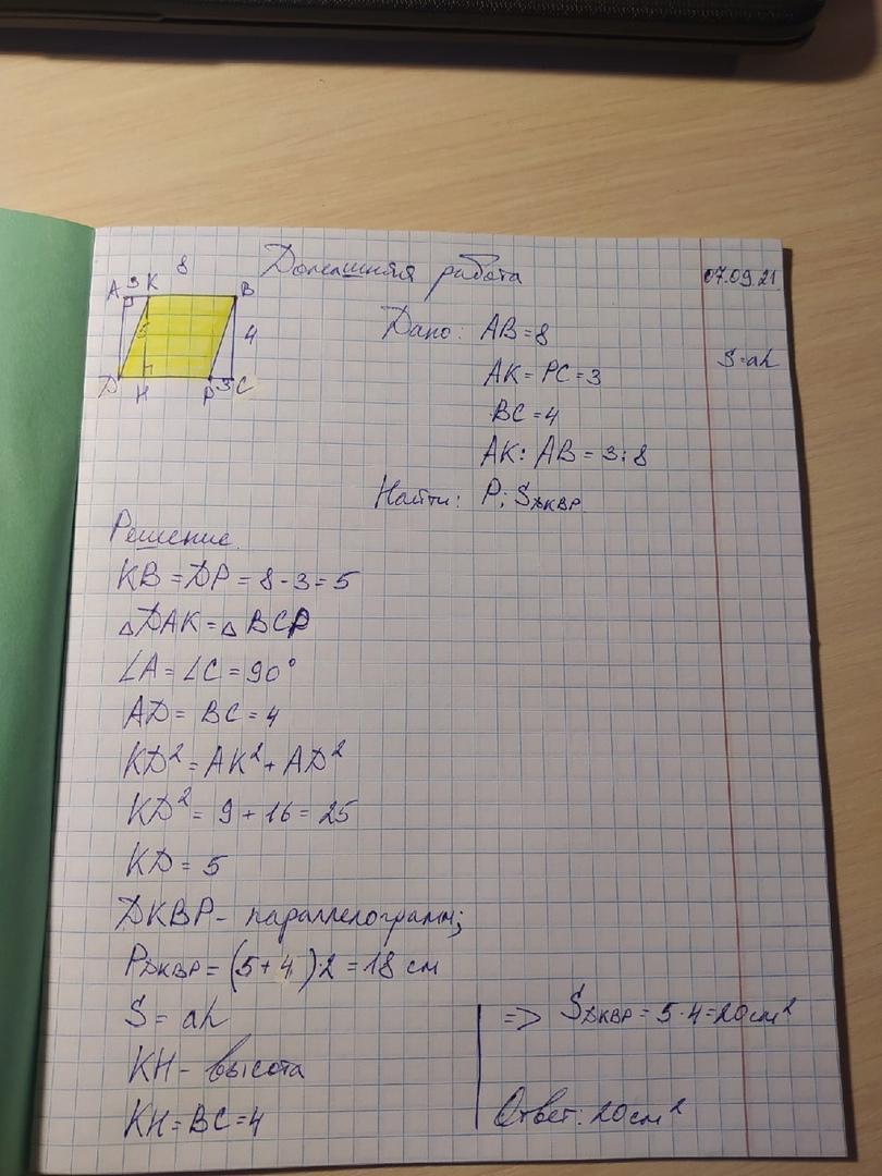 Дано: ABCD – прямоугольник, AB = 8, BC = 4, AK : AB = 3 : 8; CP : CD = 3 : 8.