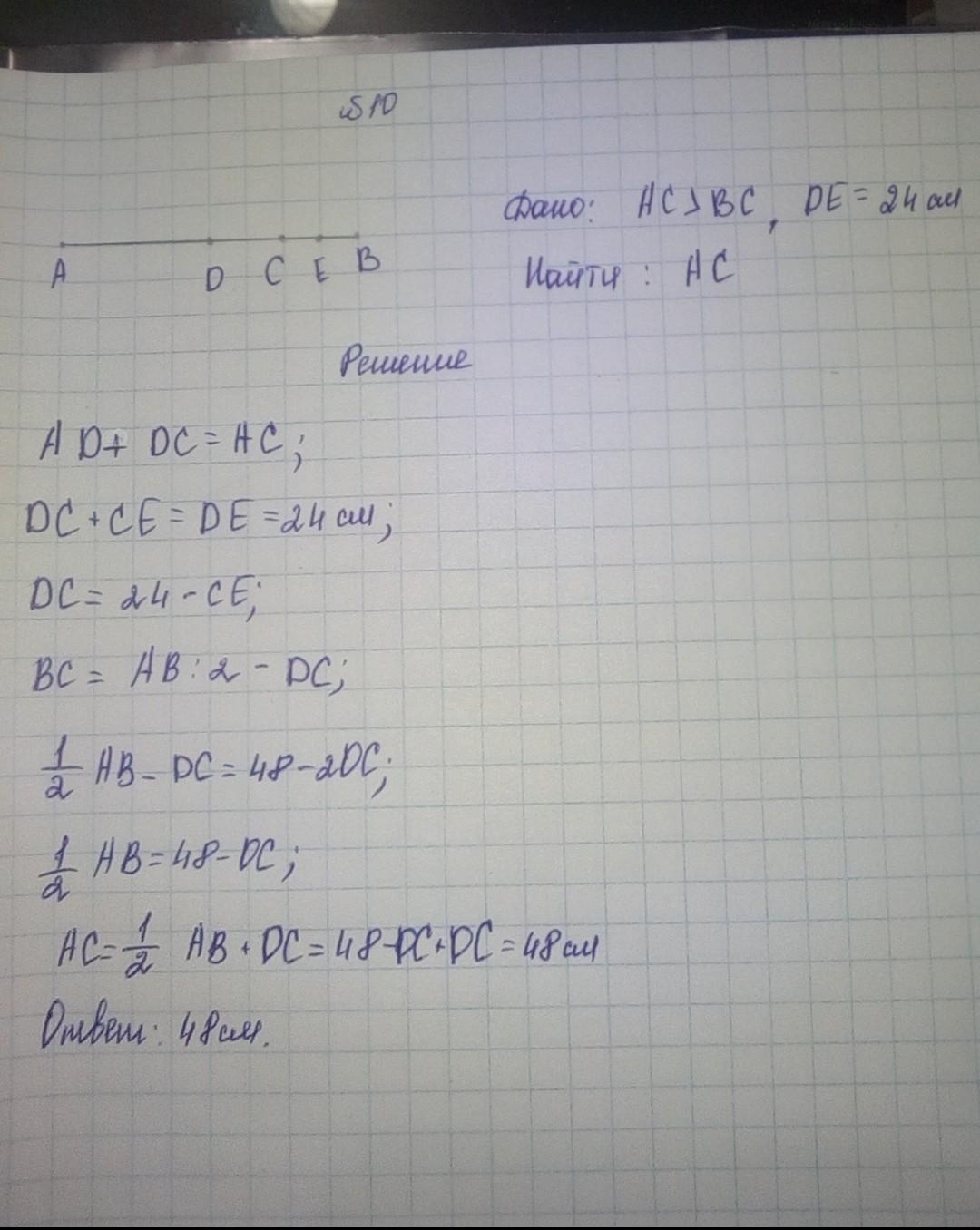 На отрезке AB отмечена точка C, где AC > ВС. Расстояние между серединой отрезка AB и серединой отрезка ВС равно 24 см. Найдите длину отрезка АС.
