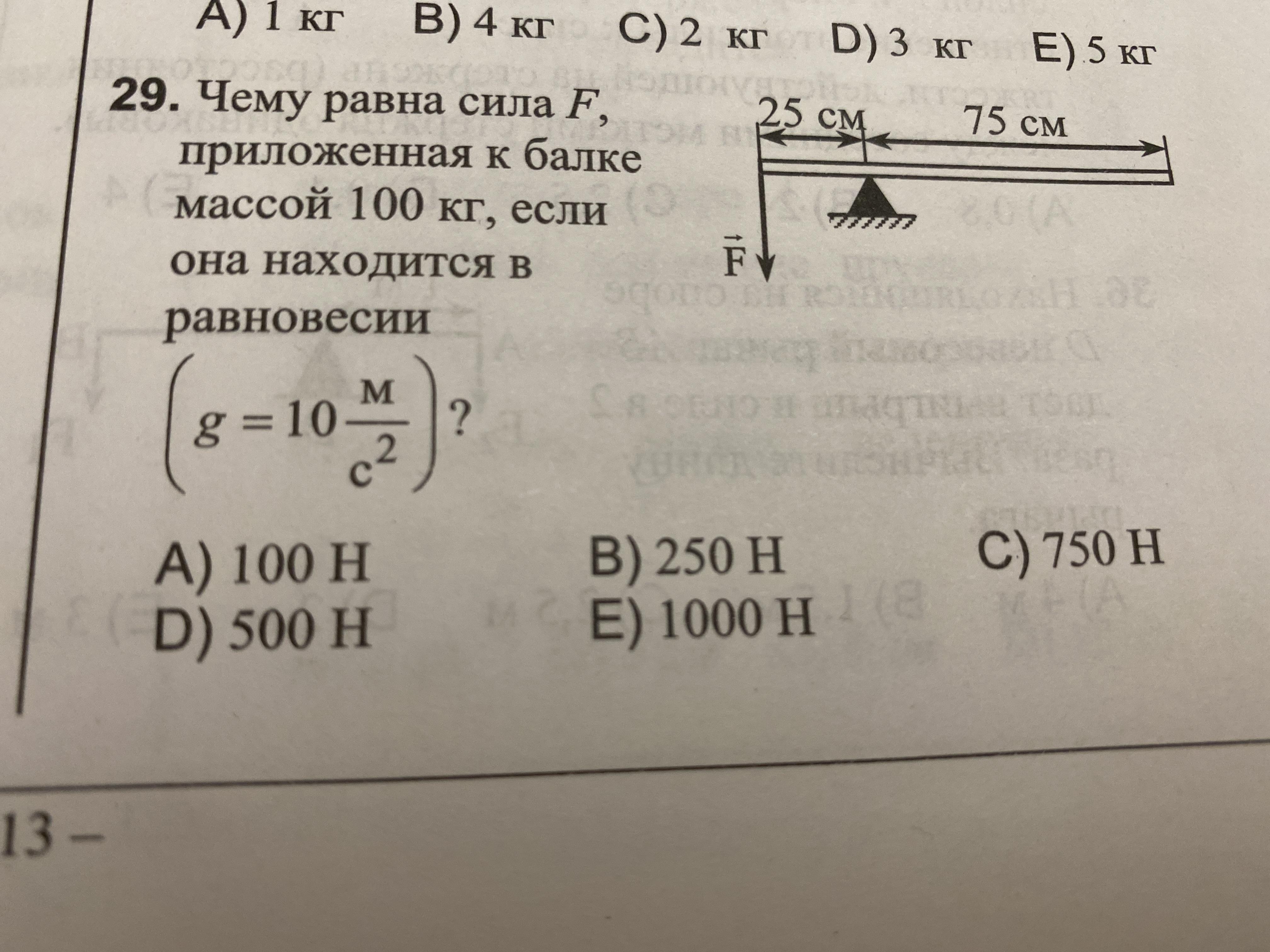 Чему равна сила F приложенный к балке массой 100 кг, если она находится в равновесии