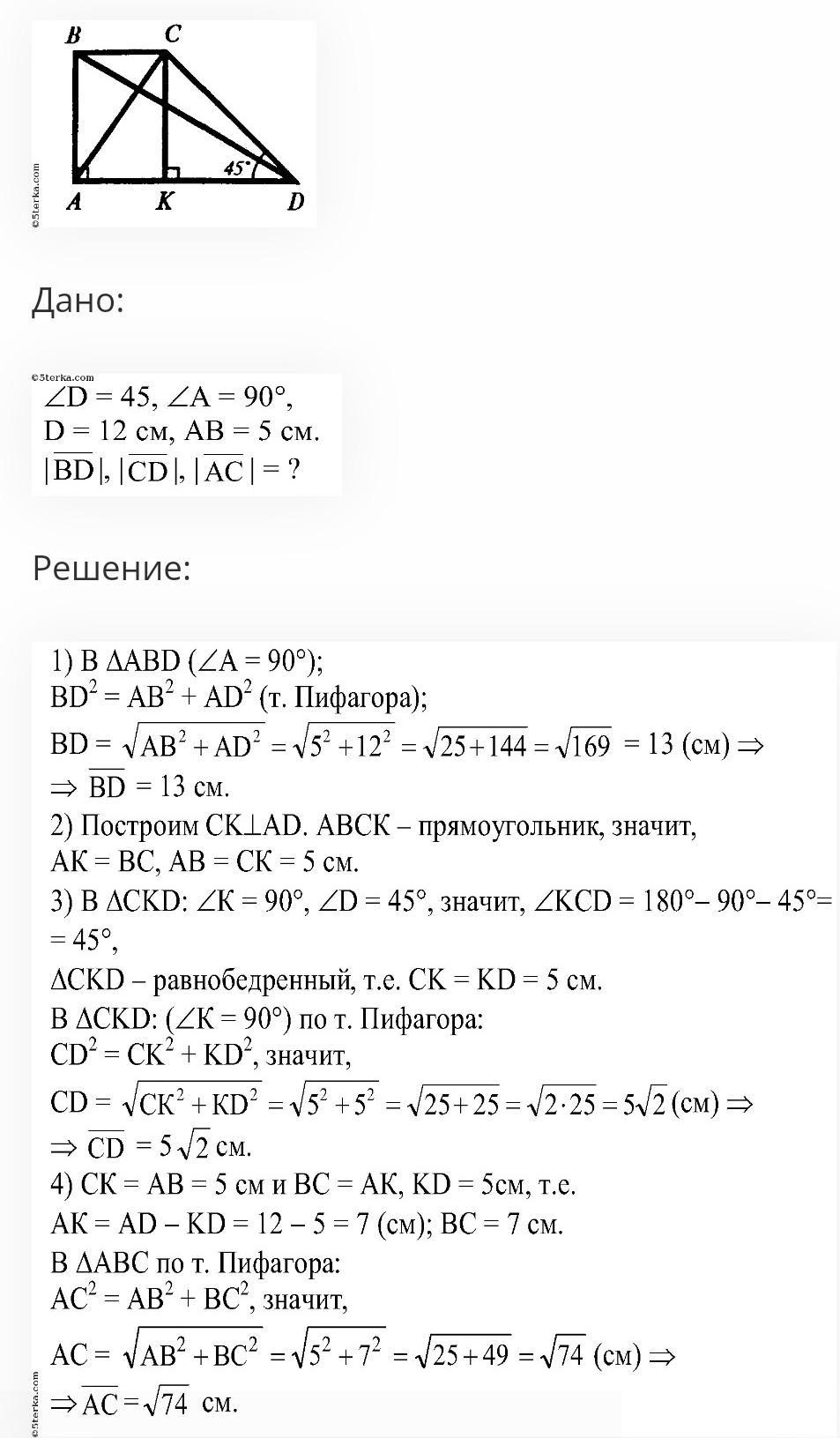 746 Основание AD прямоугольной трапеции ABCD с прямым углом А равно 12 см, AB = 5, угол D=45°.Найдите длины векторов ВD, CD, AC.
