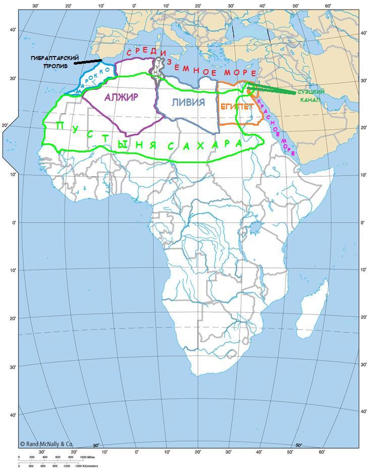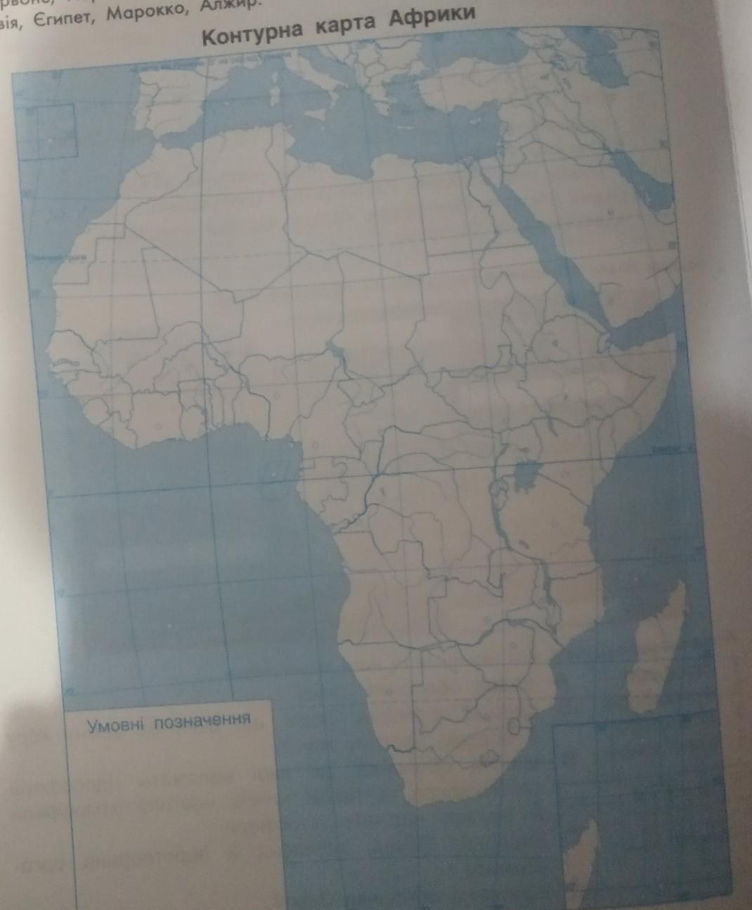 Познач на контурній карті Африки такі географічні об'єкти: моря Середземне,