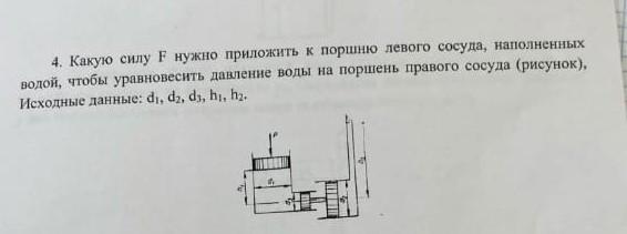 Давление, оказываемое на верхний поршень, по закону Паскаля передаётся через воду на левый нижний. Кроме того, на левый нижний также действует гидростатическое давление водного столба высотой h₁. Левый нижний жёстко связан с правым нижним. Следовательно, сила, с которой вода давит на левый нижний, передаётся с помощью этой жёсткой связи правому нижнему. На правый нижний с правой стороны действует сила гидростатического давления водного столба высотой h₂. Такая же сила должна действовать на него и с левой стороны. Но так как правый нижний жёстко связан с левым нижним, то эта сила приложена к левому. Ну а давление на левый равно сумме гидростатического давления и давления, оказываемого на верхний: