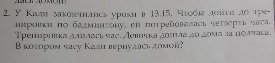 за четверть часа (это 15 минут) она дошла до тренировки, время было 13.30. вышла из тренировки через час, время 14.30. до дома полчаса. время 15