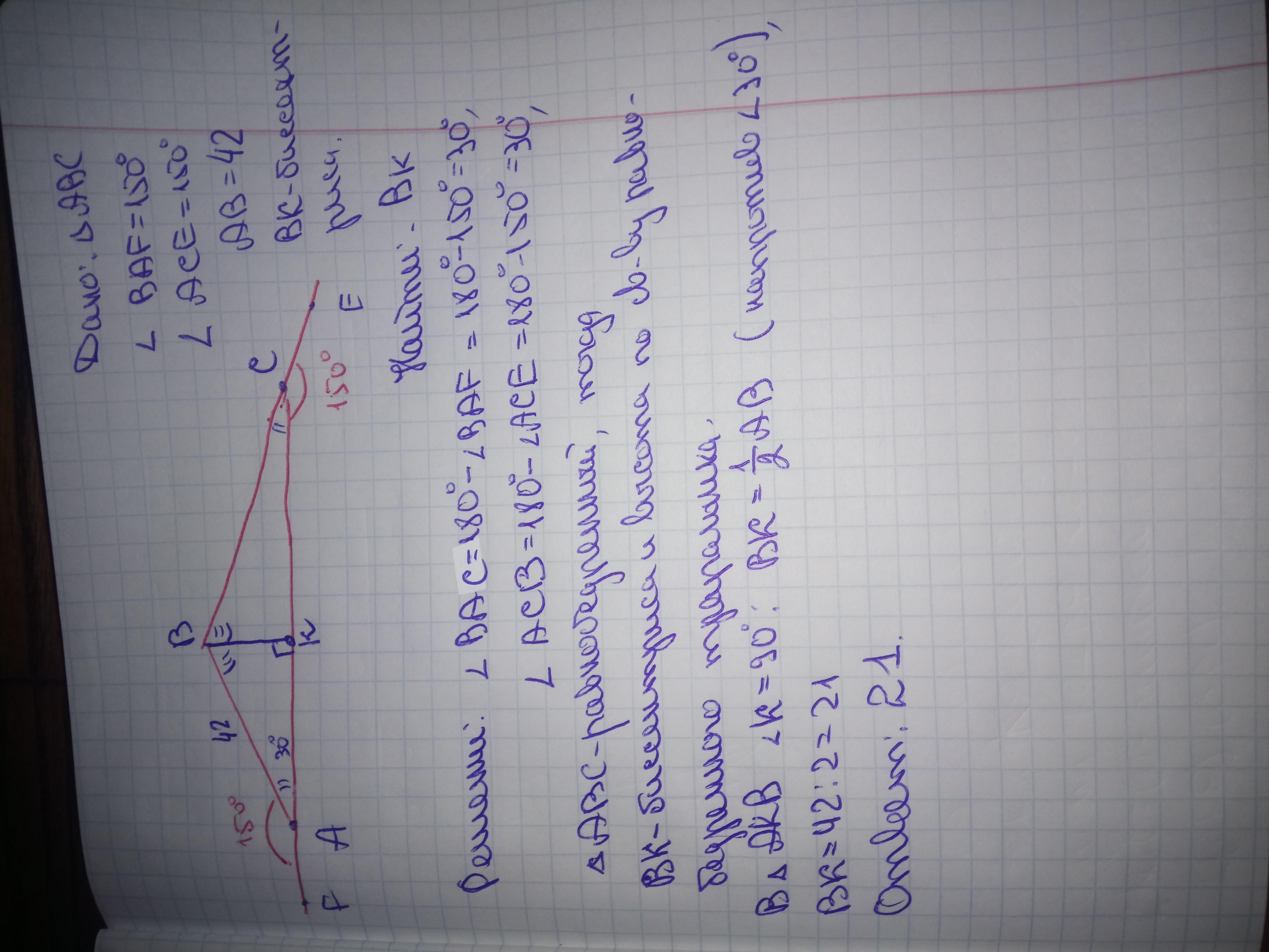 В треугольнике ABC внешние углы при вершинах A и C равны 150°, AB=42. Найдите длину биссектрисы BK. Пожалуйста дайте максимально подробное объяснение. В заранее спасибо.