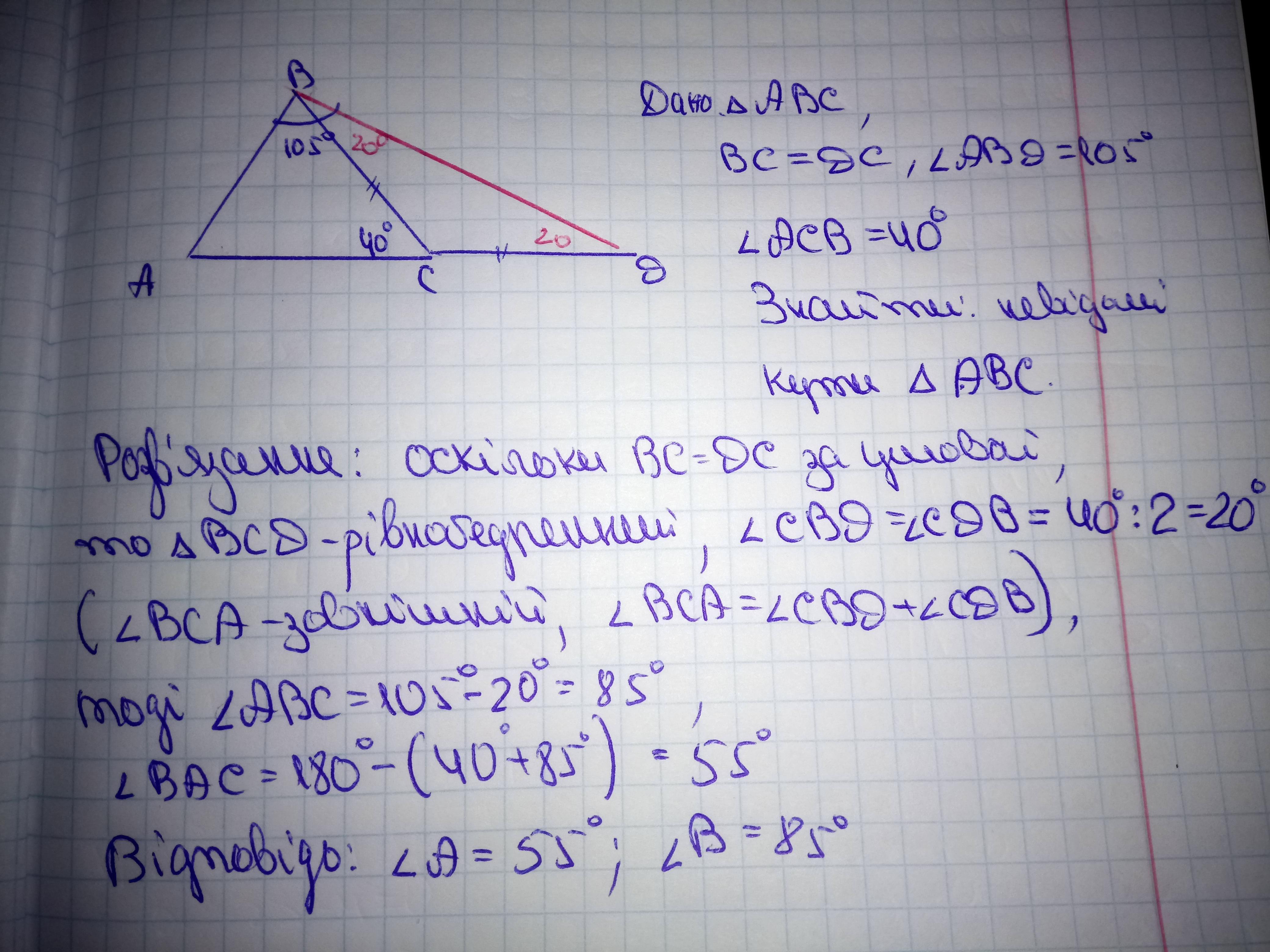 Відомо, що <АВD=105°, <АСВ=40°. Знайдіть невідомі кути трикутника АВС.