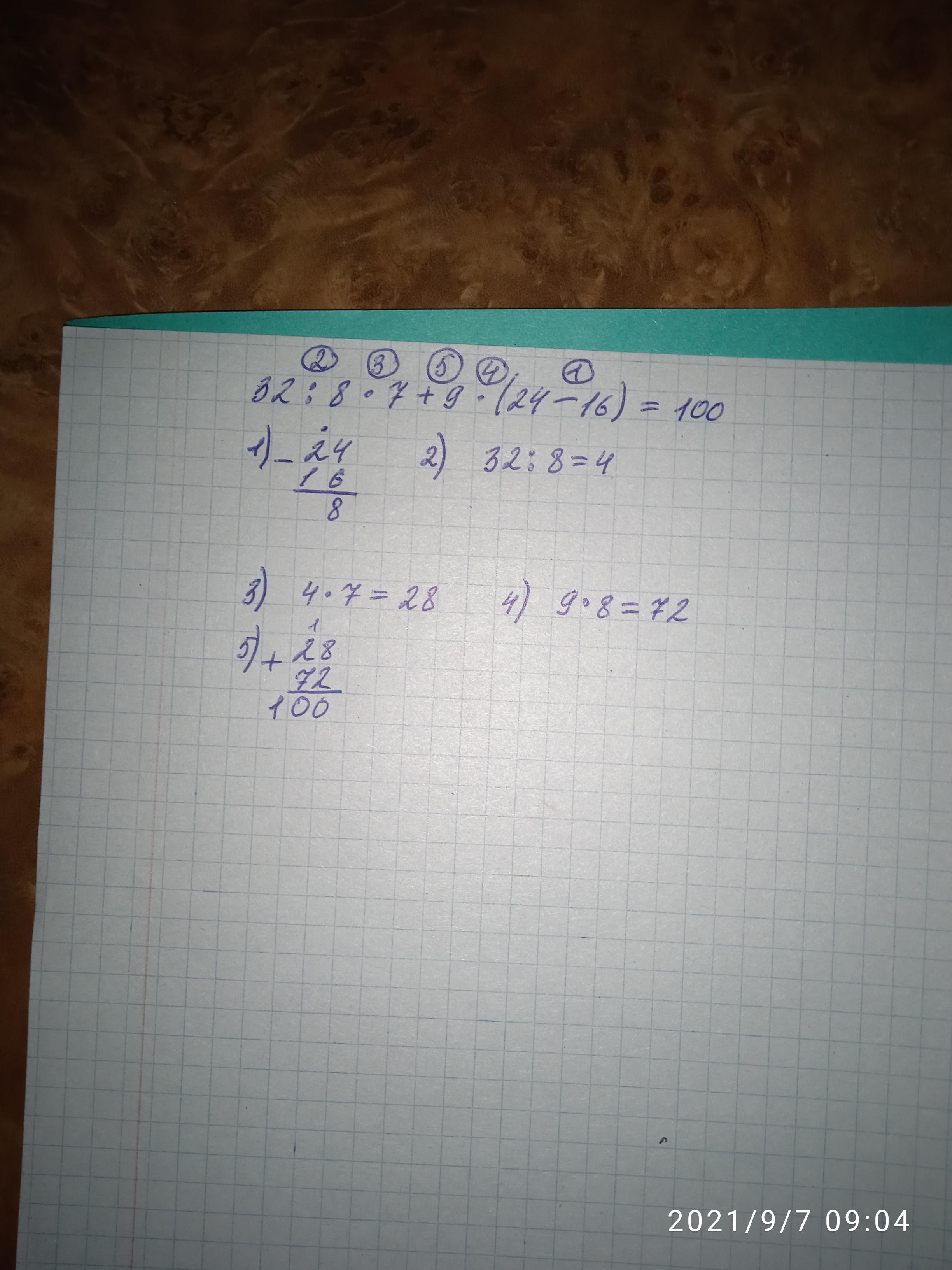 Ты неправильно решила, надо сначала в скобках, потом умножение или деление и потом только сложение или вычитание. Правильный ответ внизу