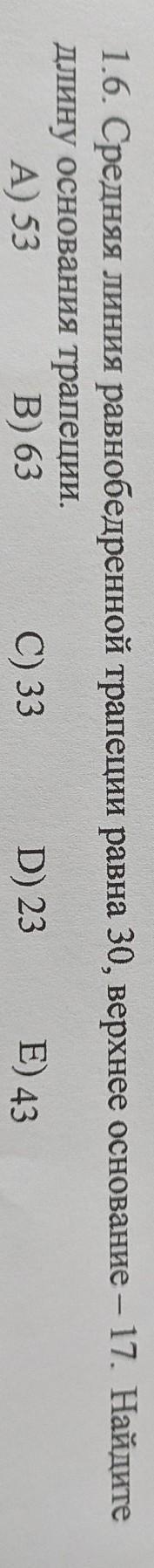 1.6. Средняя линия равнобедренной трапеции равна 30, верхнее основание - 17. Найдите длину основания трапеции. A) 53 B) 63 C) 33 D) 23 E) 43