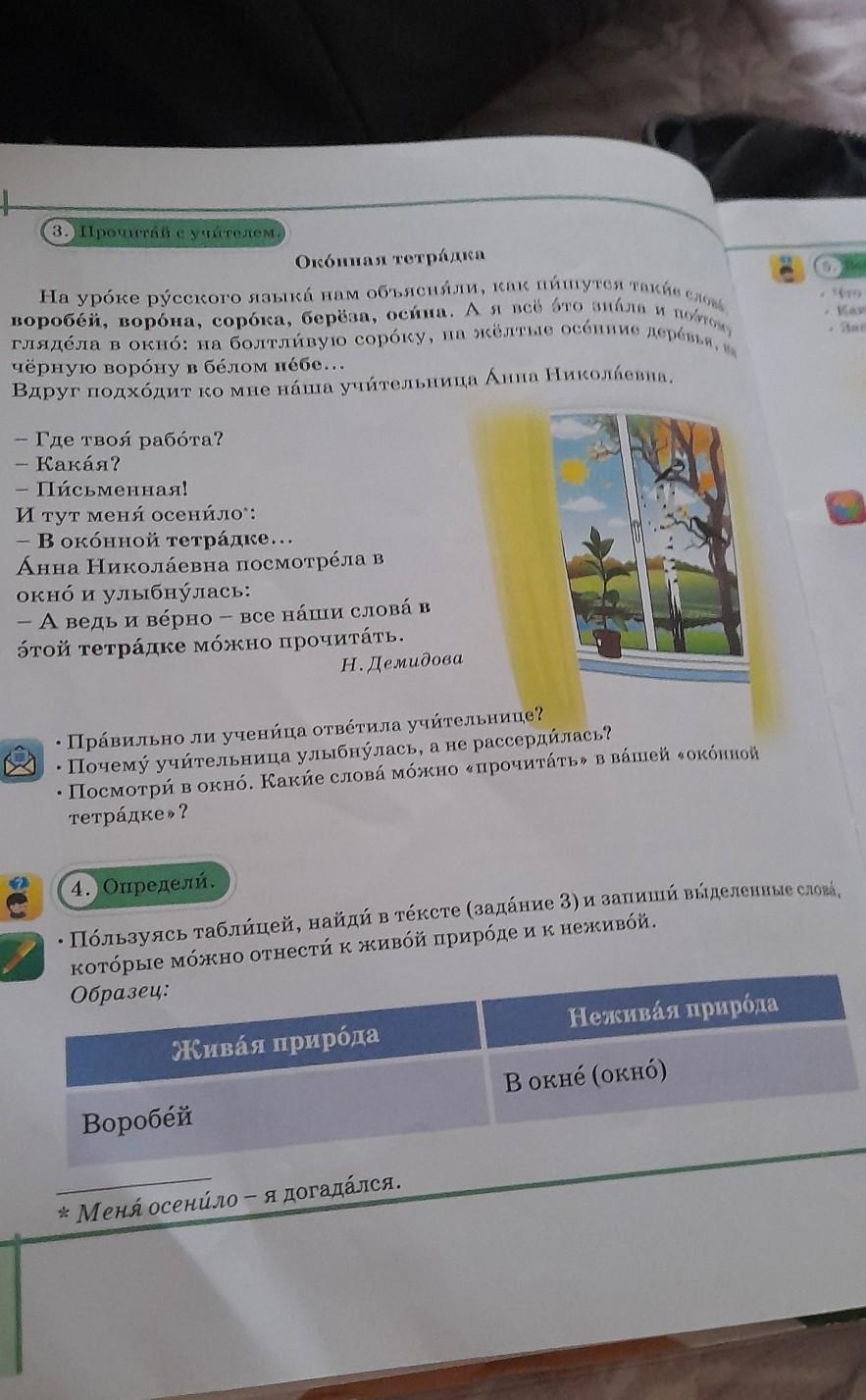 4. Определи. Пользуясь таблицей, найди в тексте (задание 3) и запиши выделенные слова которые можно отнести к живой природе их неживой. Образец: Живая природа Неживая природа Воробей В окне (окно) * Меня осенйо - я догадался. 6