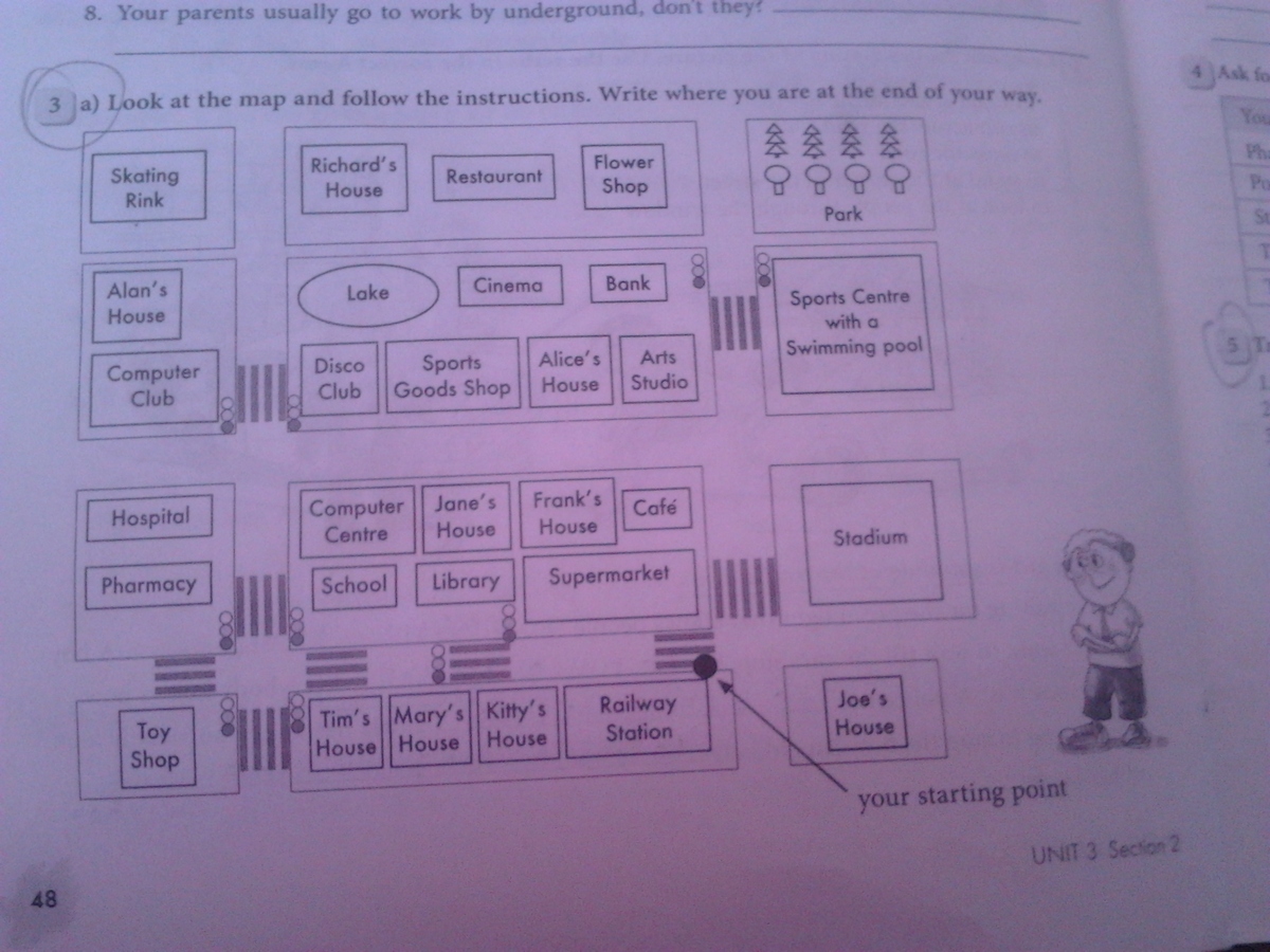 тебе нужно смотреть на карту и следовать игэнструкциям, начиная с той, около которой ты находишься (P.S. место где ты находишься отмечено точкой). когда выполнишь задание по инструкции, напиши где ты оказалась в конце пути.