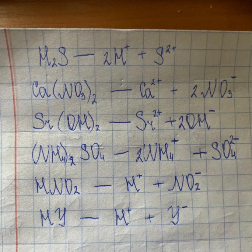 HY, H2S, Ca(NO3)2,Sr(OH)2,(NH4)2SO4,HNO2 Написать уравнение дисоциации веществ.