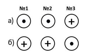 ПОМОГИТЕ ПЖ!!! Выберите верные варианты ответов о взаимодействии параллельных токов №1, №2 и №3 на рисунках.