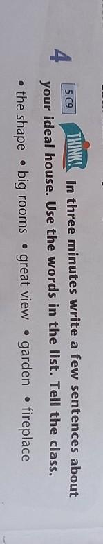 In three minutes write a few sentences about your ideal house. Use the words in the list. Tell the class.