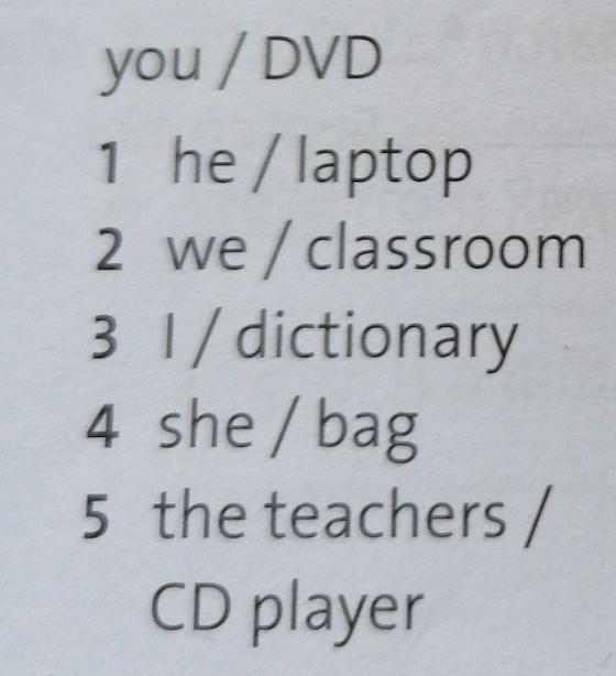 3 ** Complete the sentences. A Use possessive adjectives. you / DVD It's your DVD. 1 he/ laptop It's laptop. 2 we / classroom It's classroom. 3 1/ dictionary It's dictionary 4 she / bag It's bag. It's CD player 5 the teachers CD player