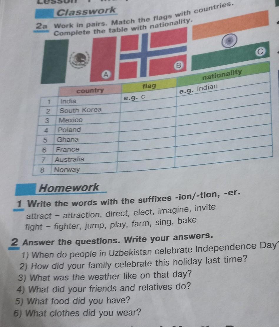 2a Work in pairs. Match the flags with countries. Complete the table with nationality.
