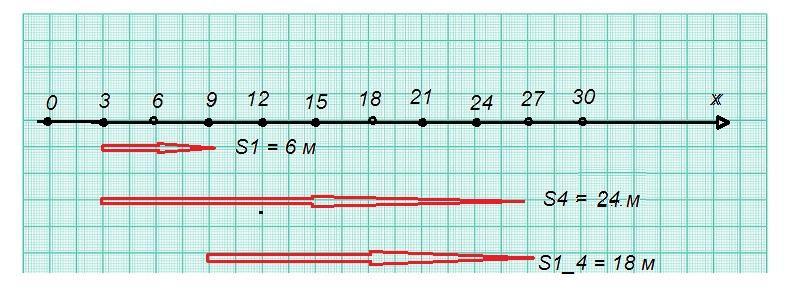 S(1_4) = x(4) - x(1) = 27 - 9 = 18 м