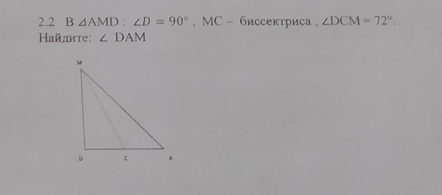 угол DAM = 180 - уголМСА - угол CMA = 180 - 108-18=54