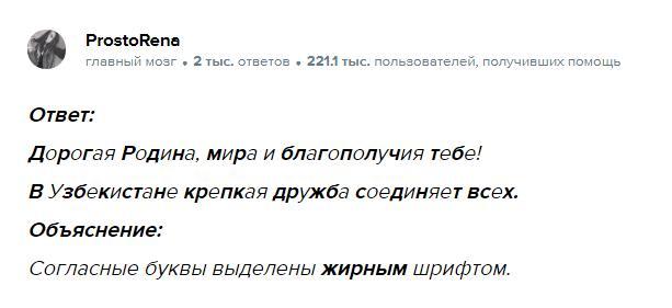"Родина, и, мира, благополучия,тебя , дорогая. Дружба, всех, соединяет, Узбекистан, крепкая. " востонавите предложения и запишите их, подчеркните согласные буквы.