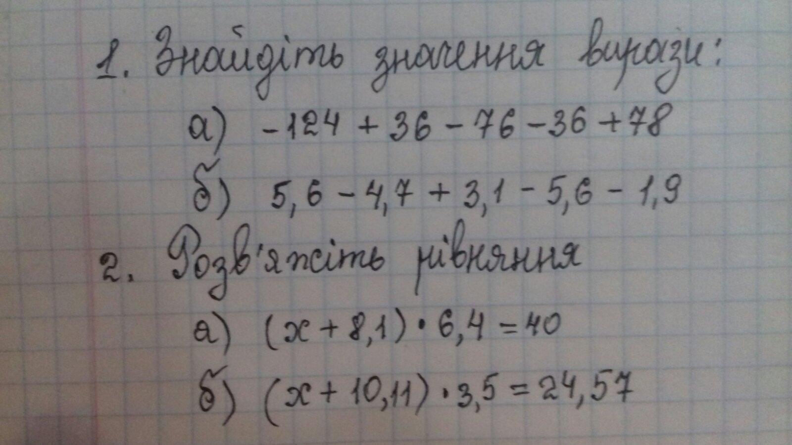 Ответ:1)-124+36=-88 2)76-36=40 3)40+78=138 4)-88-138=-226. N2. 1)5.6-4.7=0.9 2)3.1-5.6=-2.5 3)-2.5-1.9=-4.4 4)0.9+(-4.4)=-3.5
