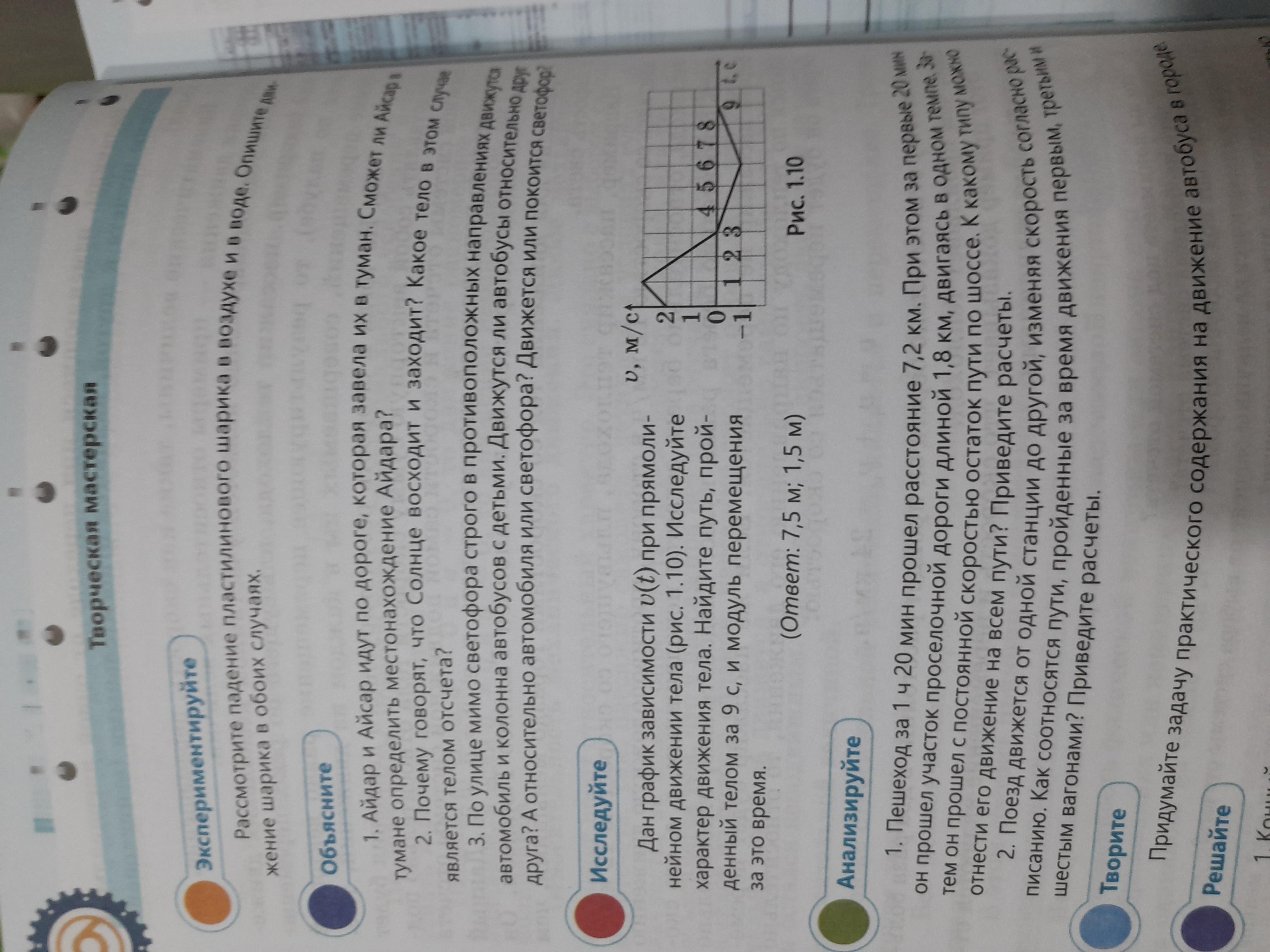 Дан график зависимости v(t) при прямолинейном движении тела (рис. 1.10). Исследуйте характер движения тела. Найдите путь, пройденный телом за 9 с, и модуль перемещения за это время.