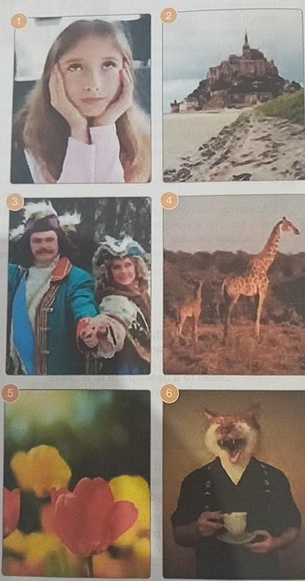 Помогитепожалуйста))).16 Match the photos (1-6) to the comments (a-f). Check the meaning of the words in bold in a dictionary. Then listen, check and repeat. a It's an interesting photo of a famous place. It's very dramatic. b It's a dull, silly photo. I don't like it. 1 c I love wildlife photos. This one is dark, but it's lovely. d It's a bit blurred, but I like it. It's really colourful! e It's obviously fake and it looks really horrible! f The clothes are old-fashioned, but the photo is amusing