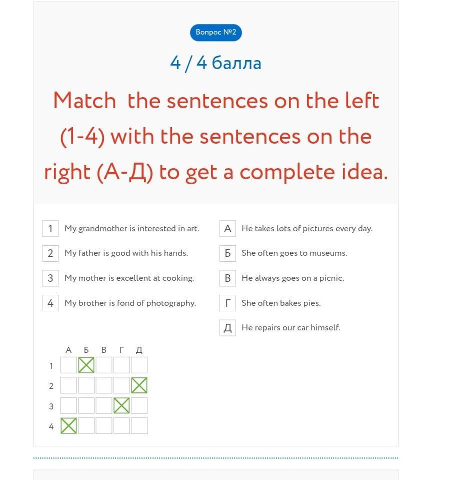 Match the sentences on the left (1-4) with the sentences on the right (A-Д) to get a complete idea.