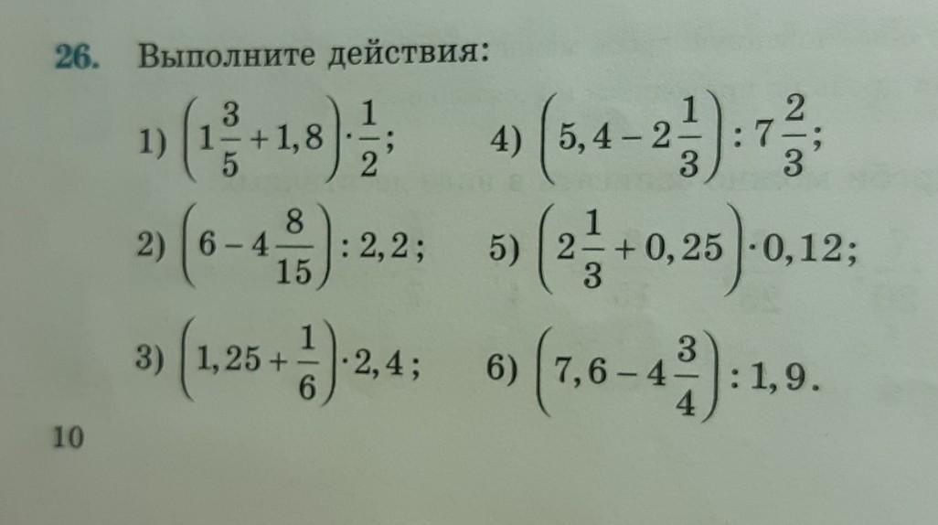 26. Выполните действия: 1) (13+1,8), 4(5,4-2):73 2(6-4%):22; 5) (2} +0,26 ):0,1 3) (1.25 +) 24: 6(1,6-43):1, : 1,9.