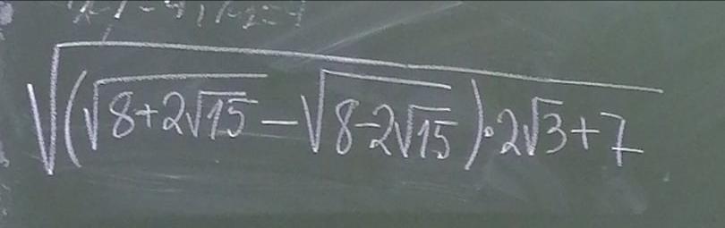 \sqrt{(\sqrt{8+2\sqrt{15}}-\sqrt{8-2\sqrt{15}})\cdot 2\sqrt3+7}=\\\\\\=\sqrt{\Big(\sqrt{5+3+2\cdot \sqrt5\cdot \sqrt3}-\sqrt{5+3-2\cdot \sqrt5\cdot \sqrt3}\Big)\cdot 2\sqrt3+7}=\\\\\\=\sqrt{\Big(\sqrt{(\sqrt5+\sqrt3)^2}-\sqrt{(\sqrt5-\sqrt3)^2}\Big)\cdot 2\sqrt3+7}=\\\\\\=\sqrt{\Big(|\sqrt5+\sqrt3|-|\sqrt5-\sqrt3|\Big)\cdot 2\sqrt3+7}=\\\\\\=\sqrt{\Big(\sqrt5+\sqrt3-\sqrt5+\sqrt3\Big)\cdot 2\sqrt3+7}=\\\\\\=\sqrt{2\sqrt3\cdot 2\sqrt3+7}=\sqrt{4\cdot 3+7}=\sqrt{12+7}=\sqrt{19}