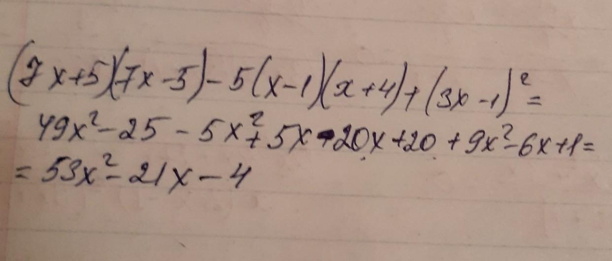 (7х+5)(7х-5)-5(х-1)(х+4)+(3х-1)² срочно нужно мне 34 лет