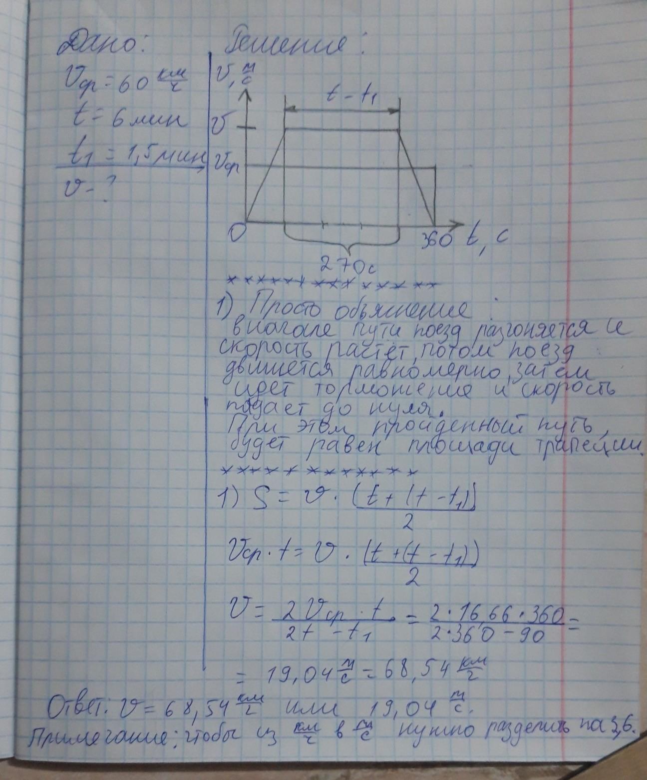 Поезд прошёл отрезок между двумя станциями за t = 6 мин со средней скоростью vср = 60 км/ч. При этом на равноускоренные разгон в начале движения и торможение перед остановкой ушло в общей сложности t1 = 1,5 мин, а остальное время поезд двигался с постоянной скоростью. Чему равна эта скорость?