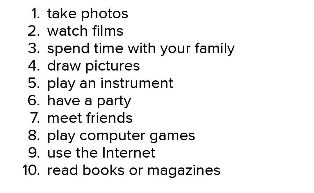 Complete the free time activities with the verbs in the box. watch take have meet play use read spend draw 2 play 7 9 10 1 2 have a party computer games 3 4 books or magazines friends films time with your family an instrument 5 6 7 8 the Internet 9 10 pictures photos