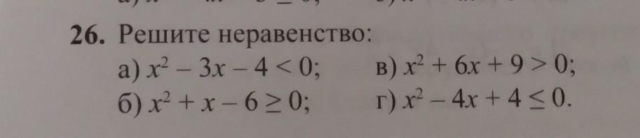 26. Решите неравенство: а) х - 3х - 4 < 0; в) х2 + 6х + 9 > 0; б) х2 +х - 6 > 0; г) х - 4х + 4