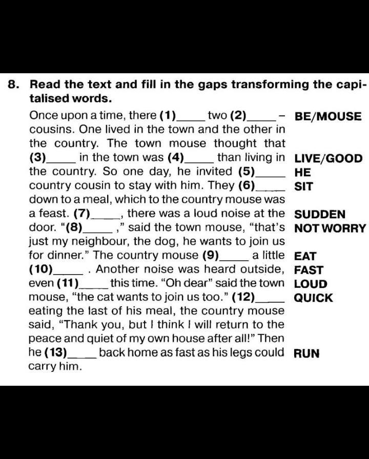 Once upon a time, there were two mice-cousins. One lived in the town and other in the country. The town mouse thought that living in the town was better than living in country. So one day, he invited his country cousin to stay with him. They sat down to a meal, which to the country mouse was a feast. Suddenly, there was a loud noise at the door. "Don't worry," said the town mouse, "that's just my neighbour, the dog, he wants to join us fir dinner." The country mouse ate a little faster. Another noise was heard outside, even louder this time/ "oh dear" said the town mouse, " the cat wants to join us too." Quickly eating the last of his meal, the country mouse said, "thank you, but i think i will return to the peace and quiet of my own house after all!" Then he ran back home as fast as his legs could carry him.