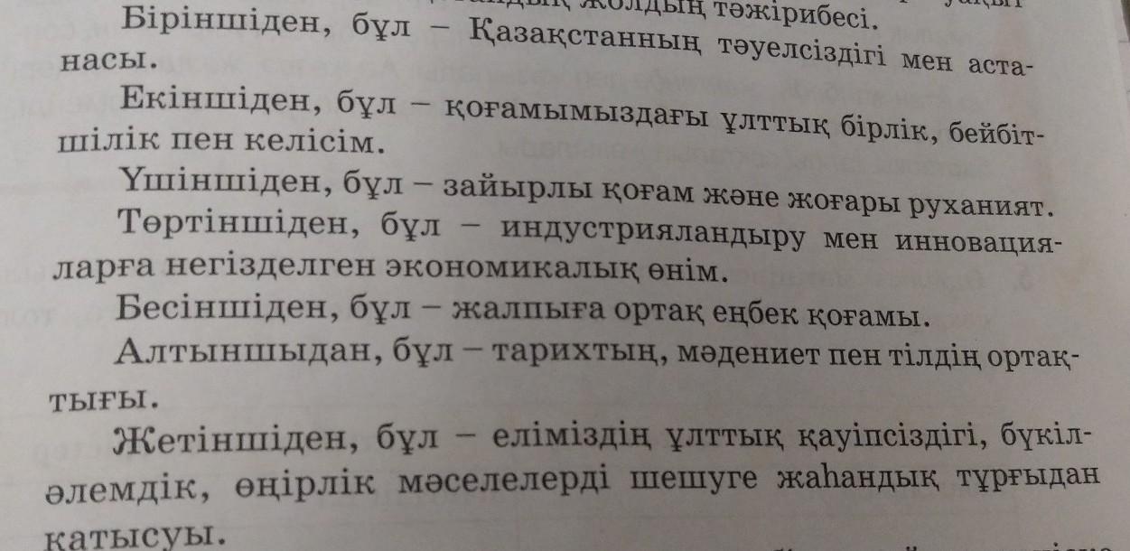Жетінші құндылықты дамытар едім. Себебі бастысы еліміздің қауіпсіздігі. Қауіпсіздік қамтамасыз етілсе бәрі де өз орнымен болады. Сонымен қатар әр түрлі өңірлерде болып жатқан мәселелерге көңіл аударып, оларды дереу шешу қажет.