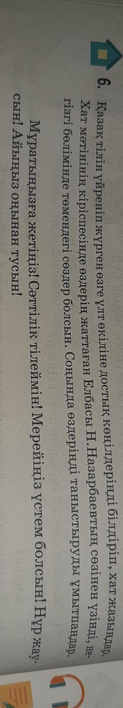 6. Қазақ тілін үйреніп жүрген өзге ұлт өкіліне достық көңілдерінді білдіріп, хат жазыңдар. Хат мәтінінің кіріспесінде өздерің жаттаған Елбасы Н.Назарбаевтың сөзінен үзінді, не- гізгі бөлімінде төмендегі сөздер болсын. Соңында өздеріңді таныстыруды ұмытпаңдар. Мұратыңызға жетіңіз! Сәттілік тілеймін! Мерейіңіз үстем болсын! Нұр жау- сын! Айыңыз оңынан тусын!