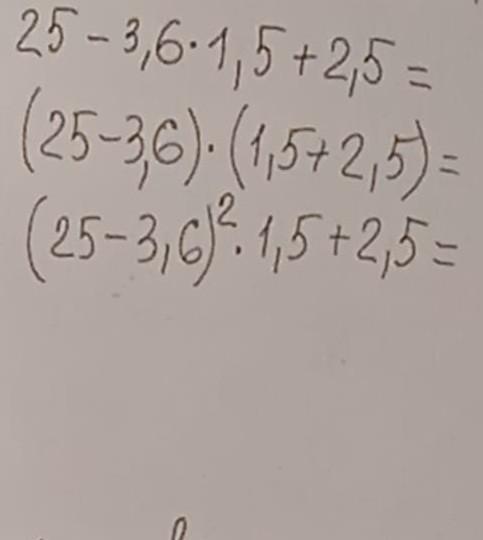 (25-3.6)*(1.5+2.5)= 1) 25-3.6= 21.4 2)1.5+2.5=4 3)21.4*4=85.6