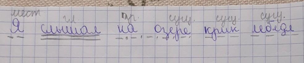 Я (____ сущ.) слышал(две черточки) на озере(_._._._.) крик (_ _ _ ) лебедя (_ _ _)