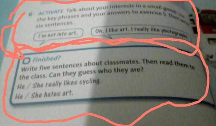Finished? Write five sentences about classmates. Then read the the class. Can they guess who they are? He/She really likes cycling. He / She- hates art. —помогите пжпжпж