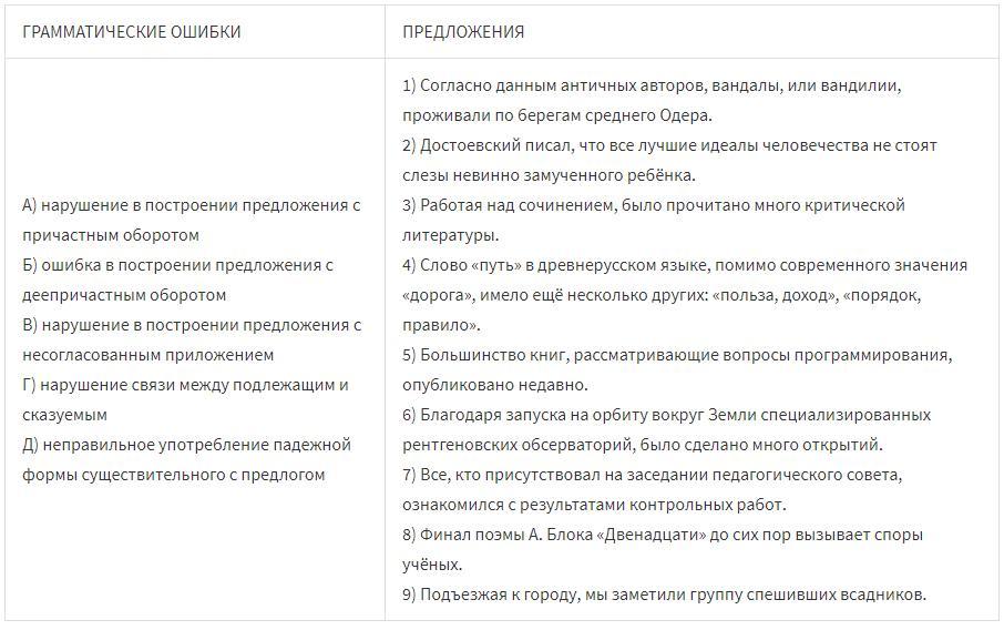 Установите соответствие между грамматическими ошибками и предложениями, в которых они допущены: к каждой позиции первого столбца подберите соответствующую позицию из второго столбца.