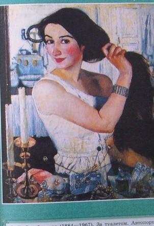 на холсте изображена девушка с длинными чëрными волосами за туалетным столиком. на нём лежат и стоят разные вещи: духи, бусы, шкатулки, свечи. перед этим столом стоит сама девушка с ярким румянцем на щеках, выразительными бровями, ярко-красными губами и тëмно-карими глазами. она одета в белую майку со спущенным рукавом. также на её руке, которой она расчёсовает волосы, виден широкий браслет.