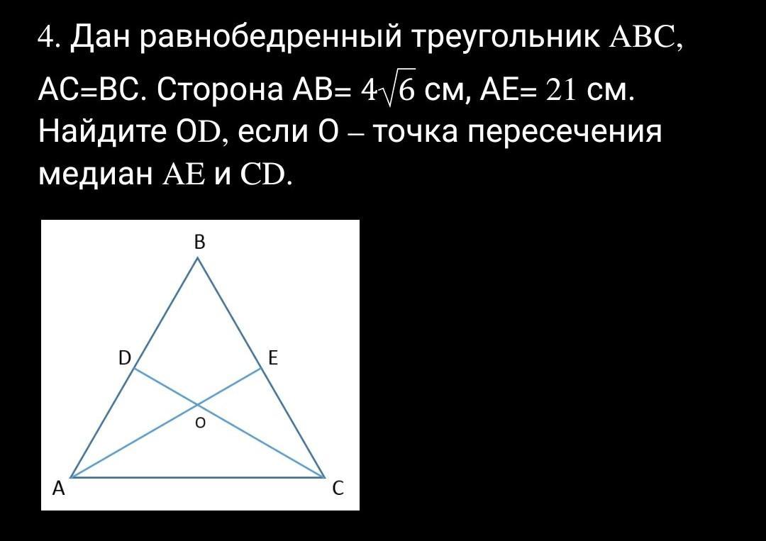Проведем медиану BH к стороне AC допустим, она же высота и биссектриса по свойству р/б треугольника, есть теорема о медианах, что все три медианы треугольника пересекаются в одной точке и делятся этой точкой в отношении 2:1, считая от вершины, значит 3 целые части - вся медиана, OC и AO - 2 части, а OD и OE - 1 часть и равна 7, ведь треугольники OD = OE (DB=BE по определению медианы, BO общая и углы DBO и EBO равны, ведь BH биссектриса.