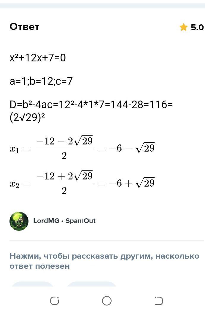 Ответ: x₁ = -12 + √29 x₂= -12 - √29