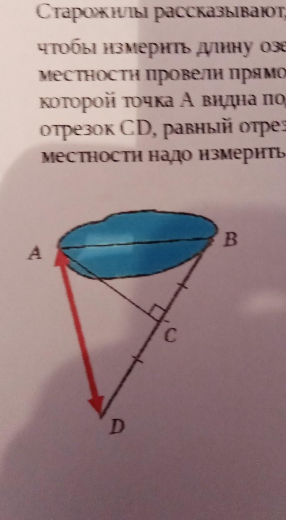 СРОЧНО ПОМОГИТЕЕЕЕ!!! Старожилы рассказывают, что чтобы измерить длину озера (расстояние АВ на рисунке) , на местности провели прямою BD, на ней выбрали Точку С, из Которой точка А видна под прямым углом, и отложили отрезок CD, равный отрезку ВС. Какое расстояние на местности надо измерить, чтобы узнать длину озера?