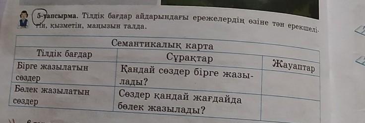 5-тапсырма. Тілдік бағдар айдарындағы ережелердің өзіне тән ерекшелі На, кызметін, маңызын талда. Жауаптар Тілдік бағдар Бірге жазылатын сөздер Бөлек жазылатын Семантикалық карта Сұрақтар Қандай сөздер бірге жазы- лады? Сөздер қандай жағдайда бөлек жазылады? сөздер