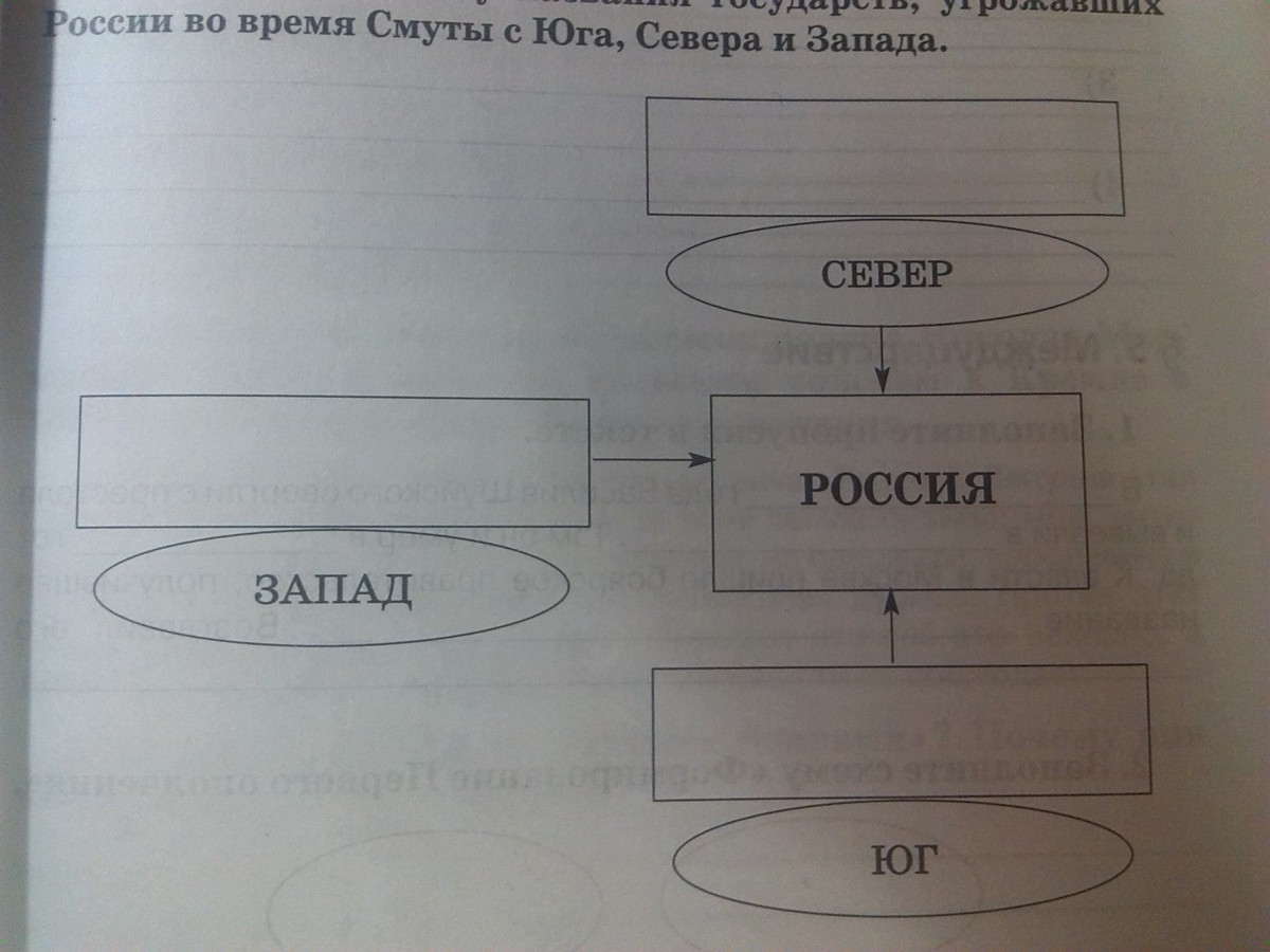 впишите в схему названия государств , угрожавших России во время Смуты с юга,Севера и Запада