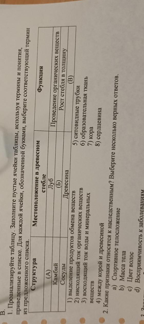 В. 1. Проанализируйте таблицу. Заполните пустые ячейки таблицы, используя термины и понятия, приведенные в списке. Для каждой ячейки, обозначенной буквами, выберите соответствующий терм Hз предложенного списка. Структура Местоположение в древесном Функция стебле (А) Луб Проведение органических вещест Камбий (Б) Рост стебля в толщину Сосуды Древесина (В) 1) выделение продуктов обмена веществ 5) ситовидные трубки 2) нисходящий ток органических веществ 6) образовательная ткань 3) восходящий ток воды и минеральных веществ 8) сердцевина 4) между корой и древесиной Kara пn 7) ко